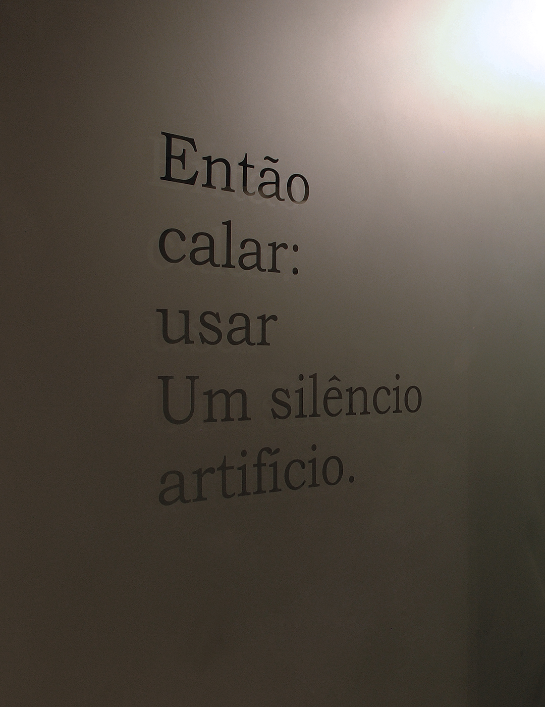 The space was divided by eight glass doors, the last of which led to the entrance to the safe, which remained closed, as an image of an inviolable secret. Thus, eight chambers were created separated by these doors. Each chamber was painted a shade of gray, gradually darkening to black in the seventh, contrasting with white in the last chamber that precedes the safe door. One of the eight phrases chosen from my Sob Neblina archive related to the ideas of silence and secrecy was engraved on each door.