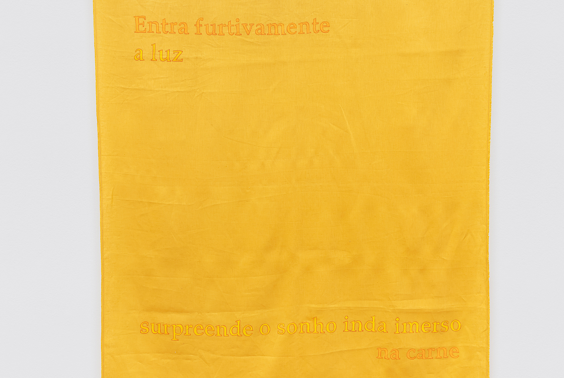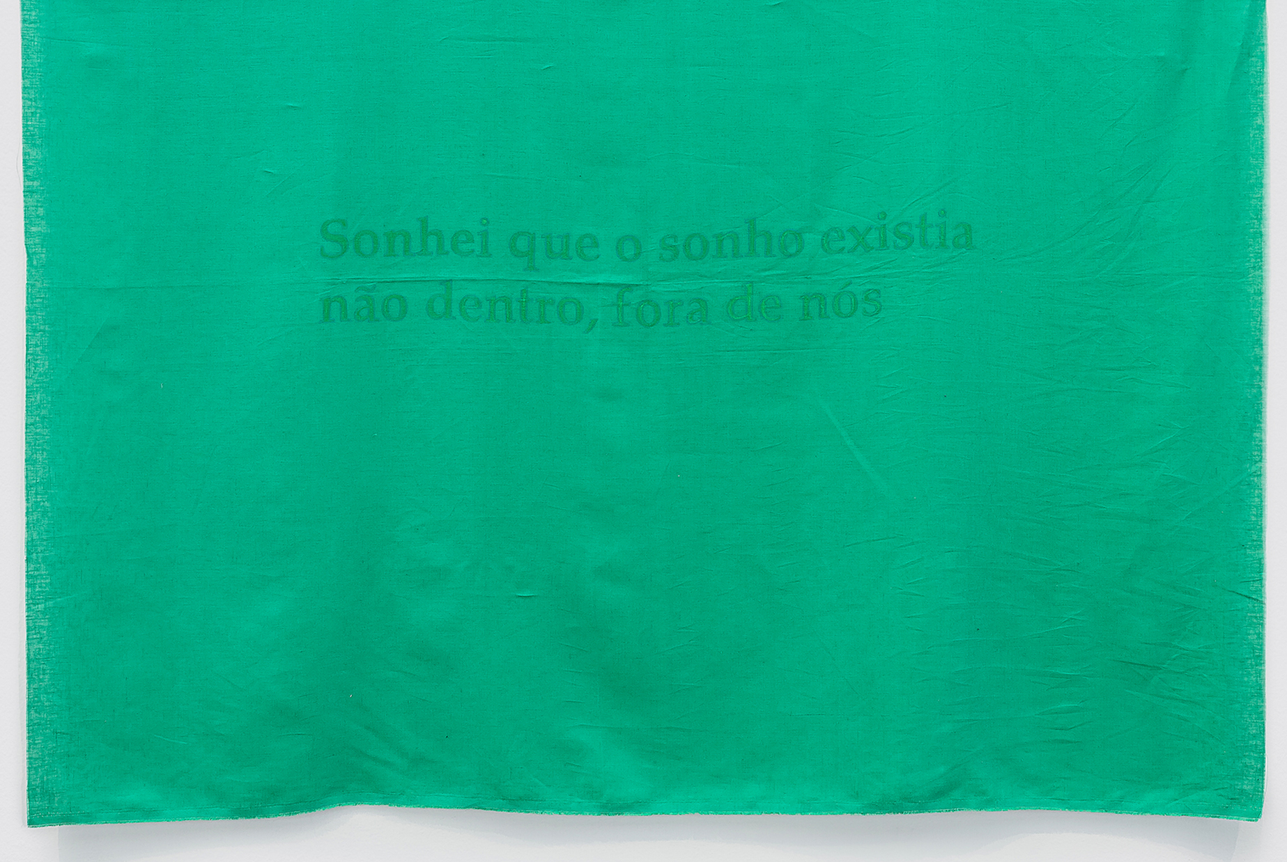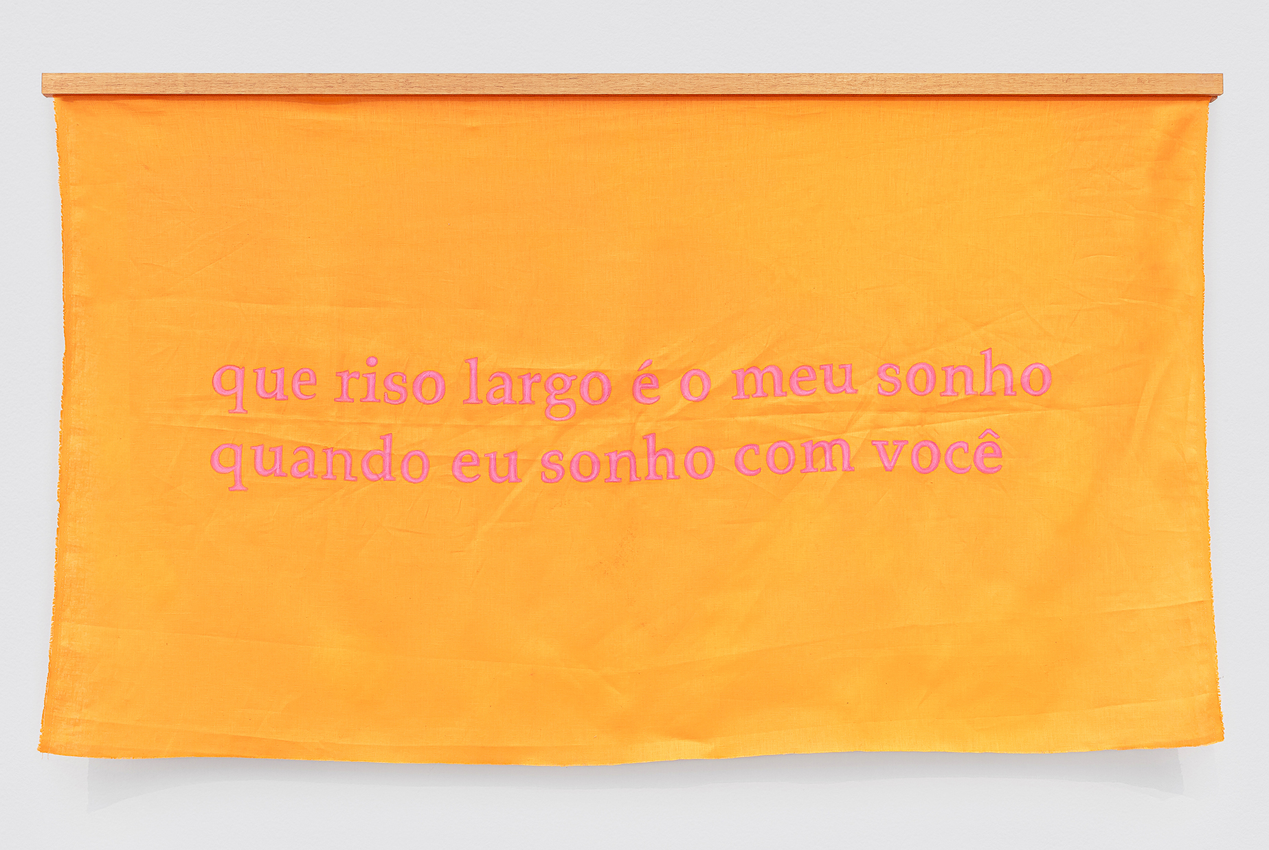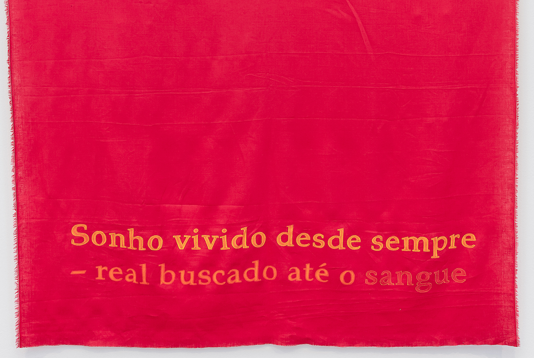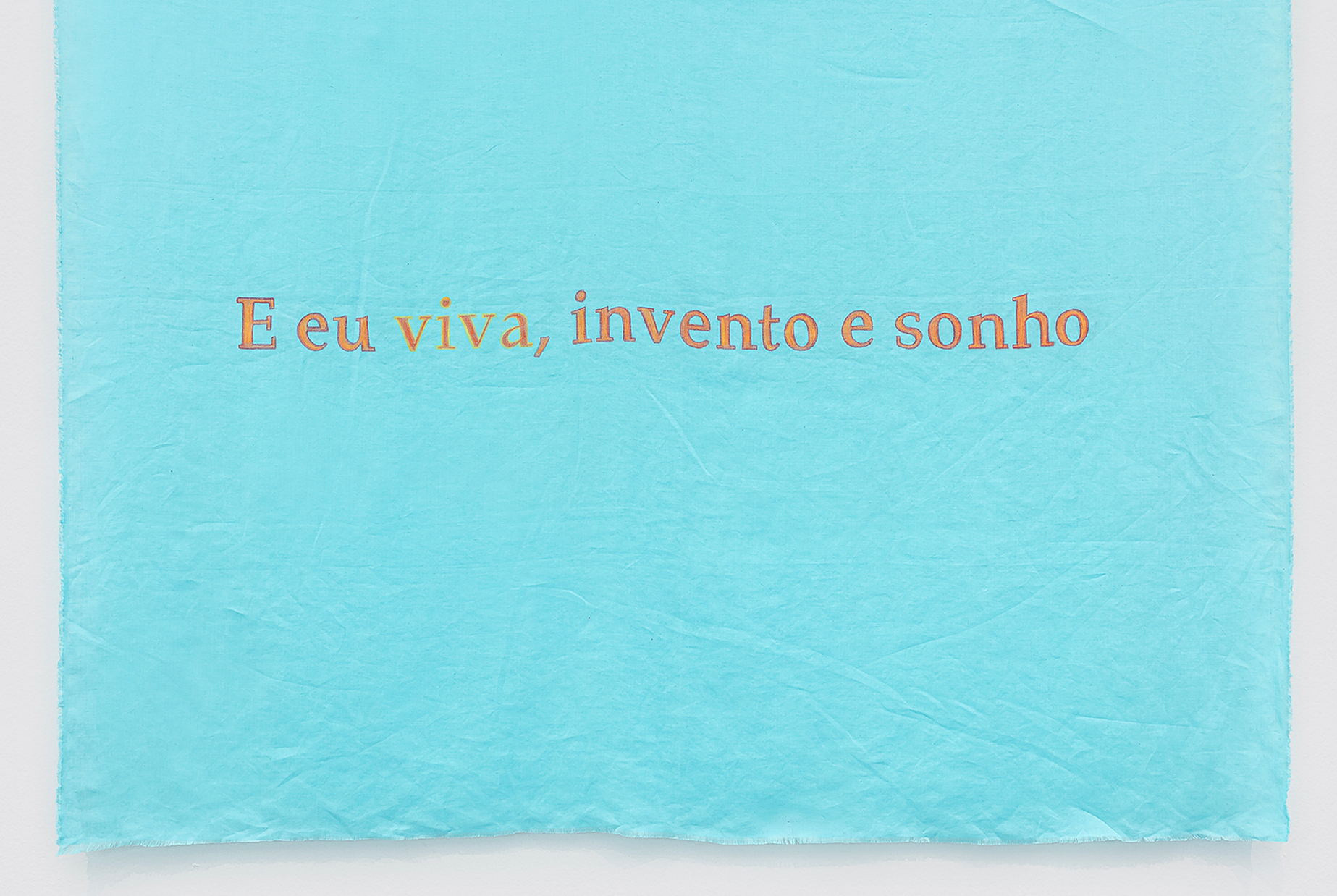 In the series Sonho encarnado (“Incarnate Dream”), verses containing the word “dream” are painted on colored linen canvases. The fabric, traditionally used as a support for oil paintings, is used here as part of the painting itself, considering its industrial colors, weave, and plasticity.