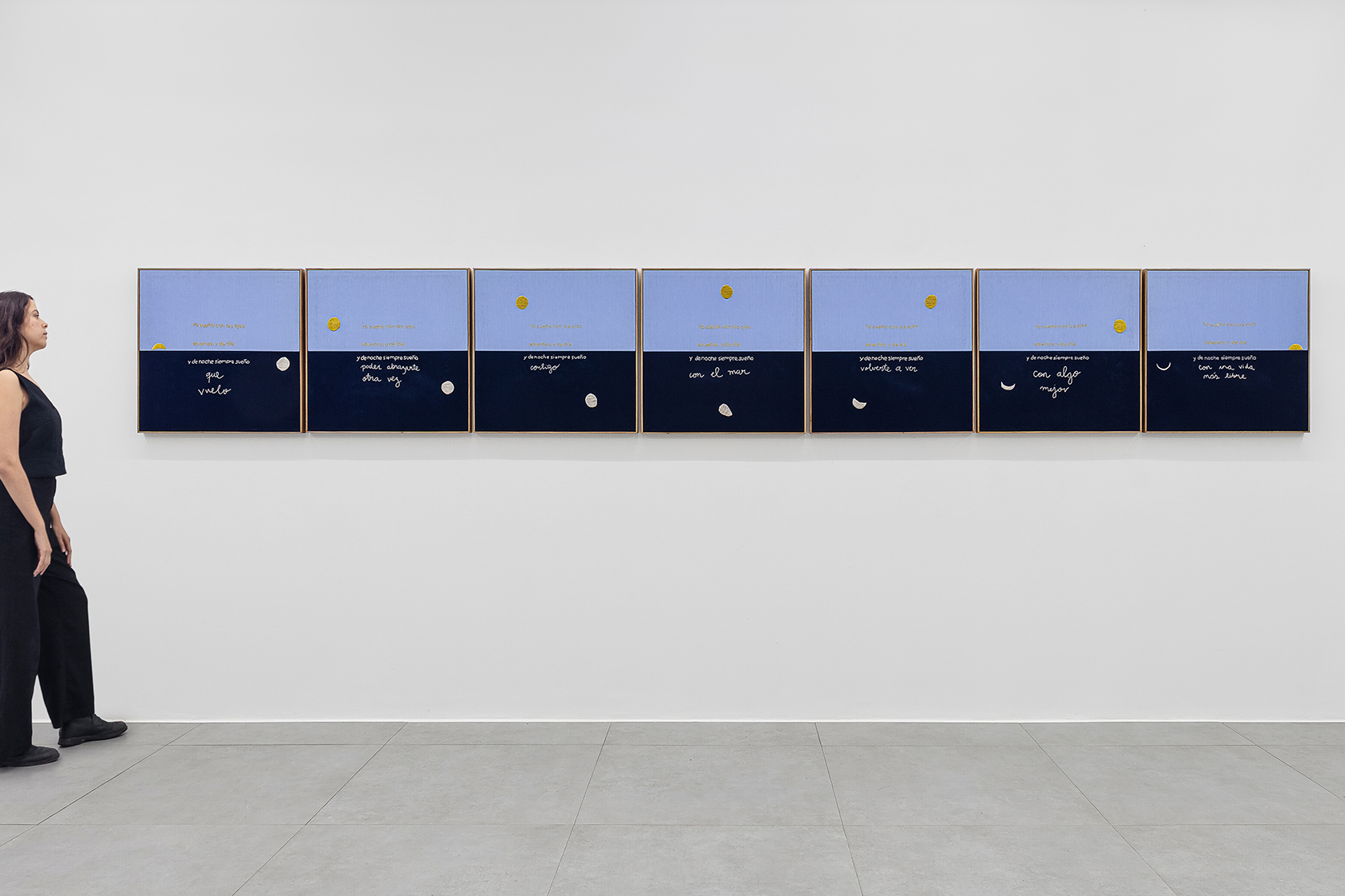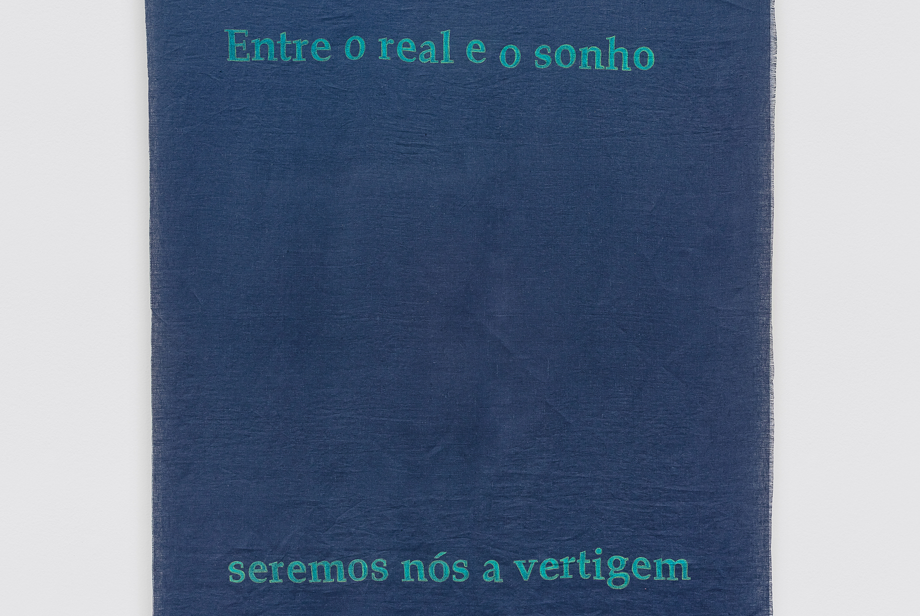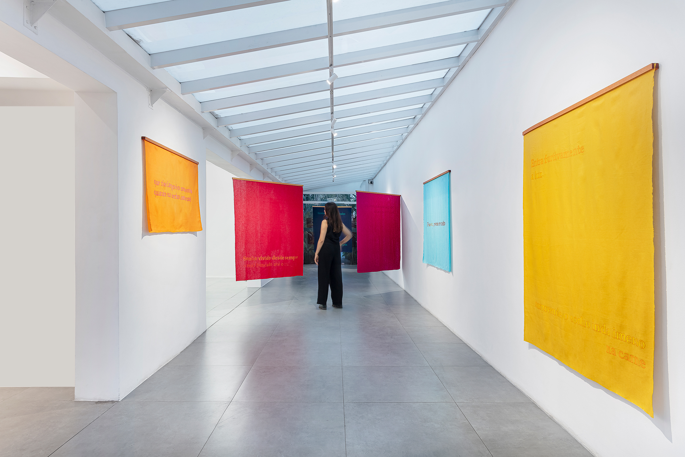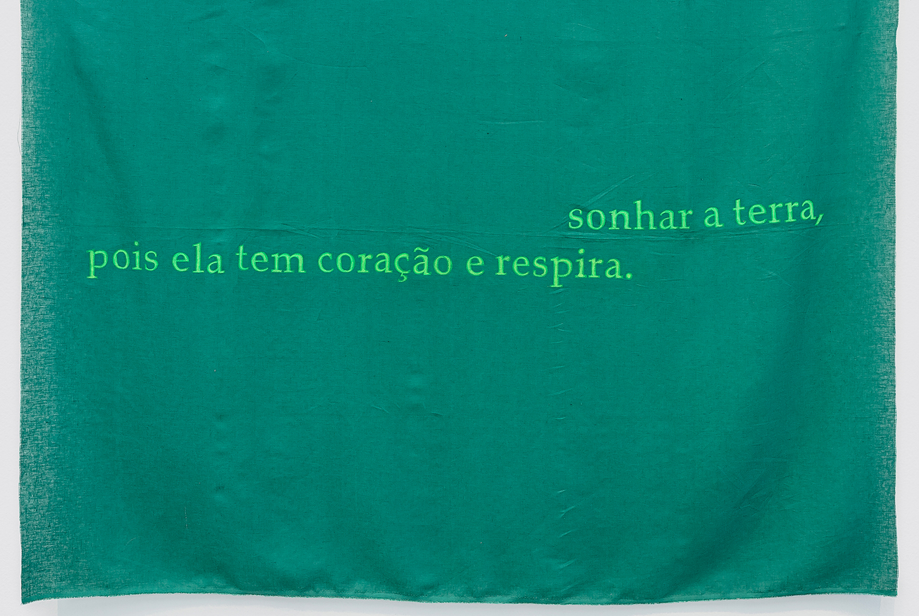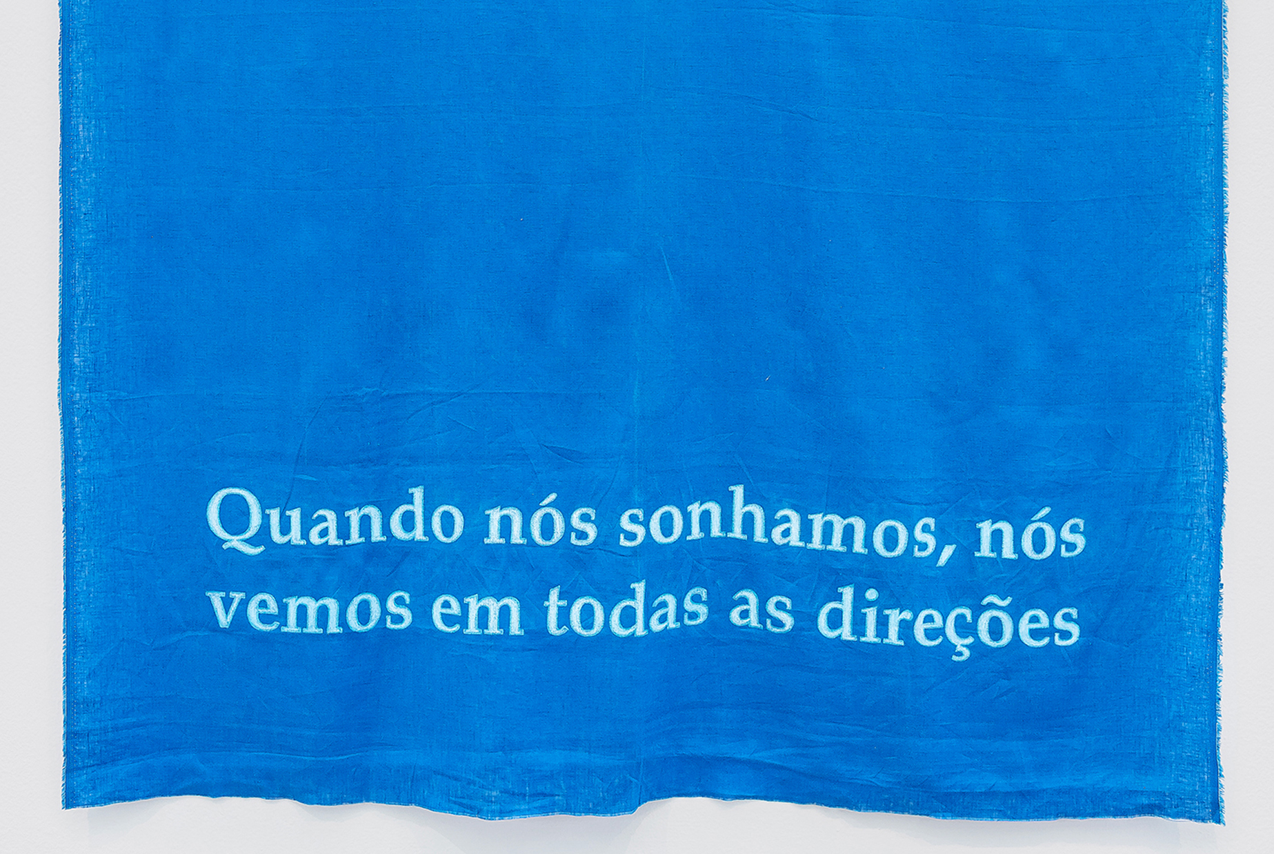 In the series Sonho encarnado (“Incarnate Dream”), verses containing the word “dream” are painted on colored linen canvases. The fabric, traditionally used as a support for oil paintings, is used here as part of the painting itself, considering its industrial colors, weave, and plasticity.