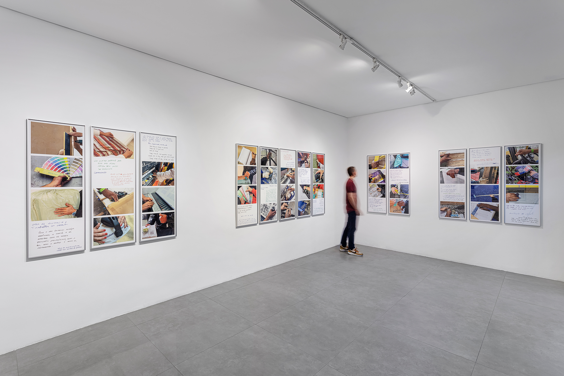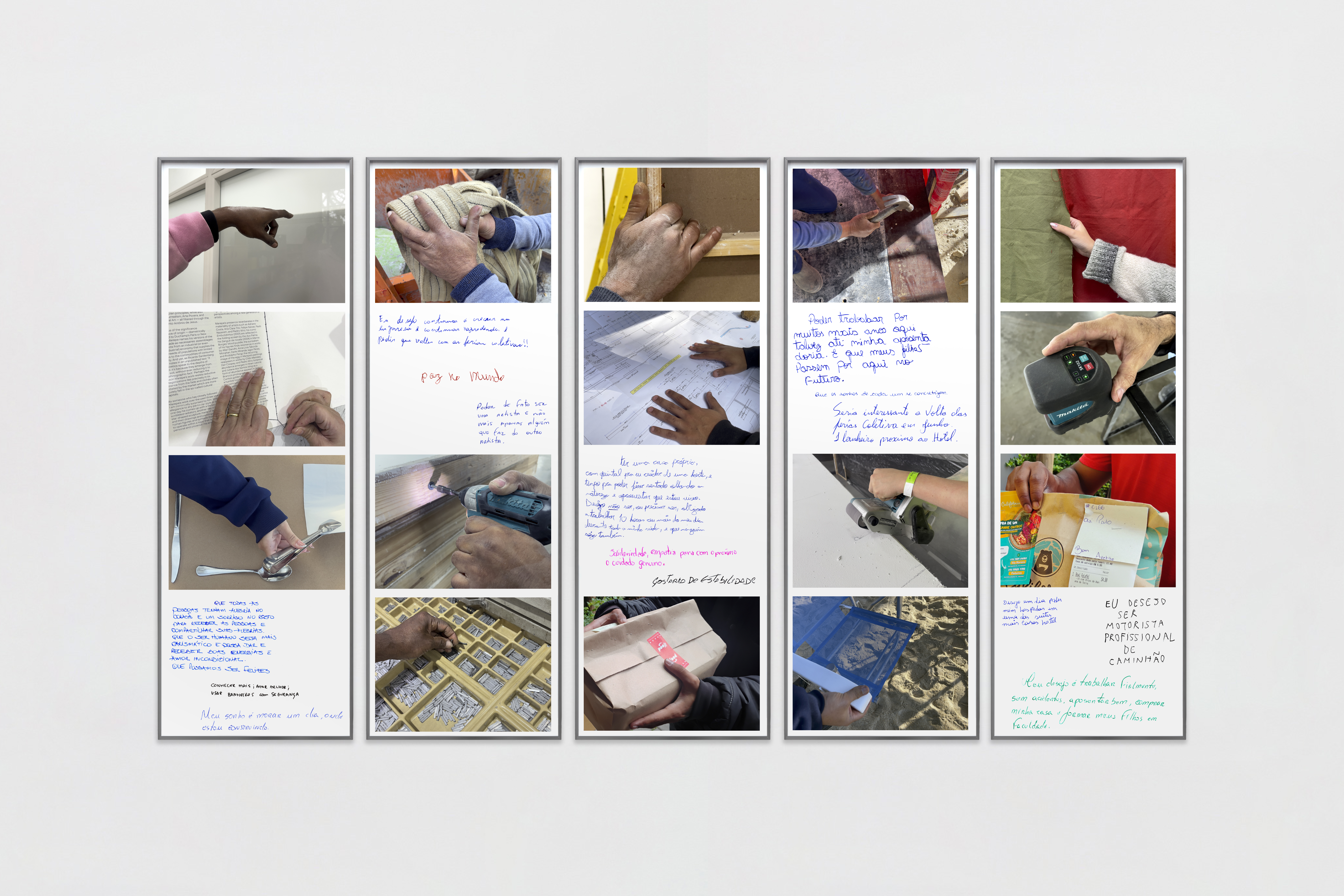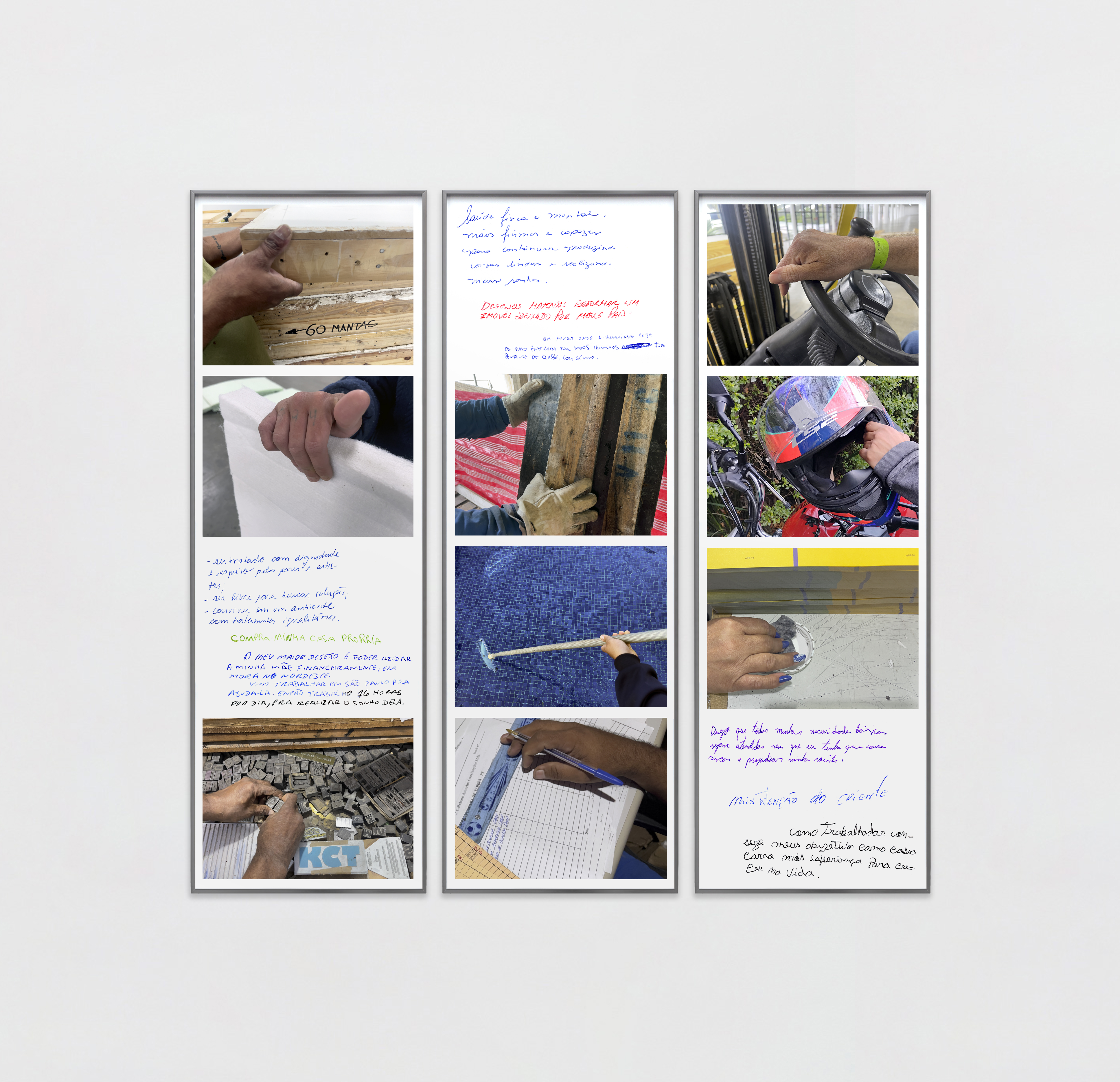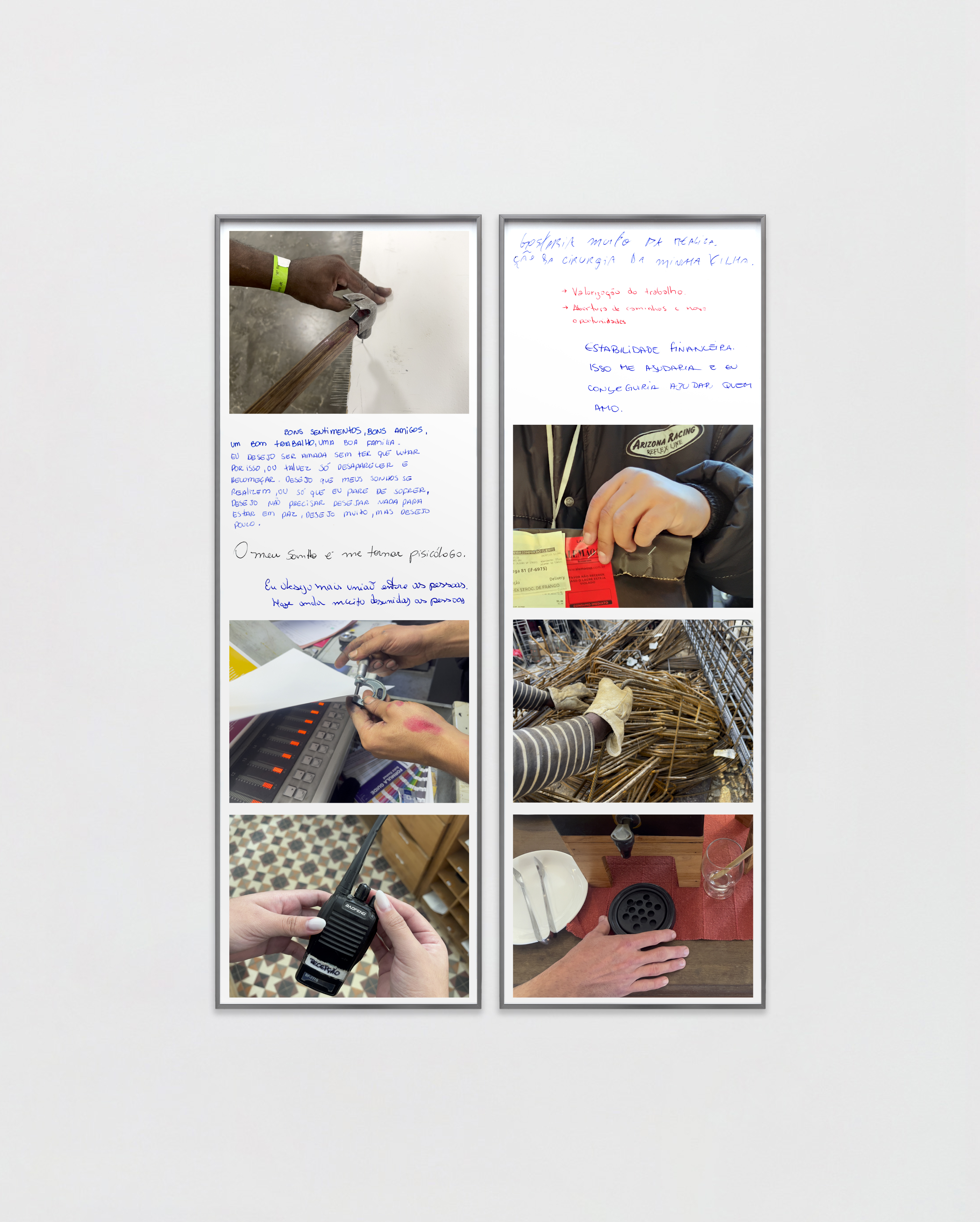 The artist photographs the hands of workers performing their tasks. They are employees of a printing company,hotel staff, delivery workers, construction workers, and workers at the São Paulo Biennial. She asks them to answer what they want, assuring the anonymity. The exhibition displays seven polyptychs with photographs and the answers in their original handwriting.