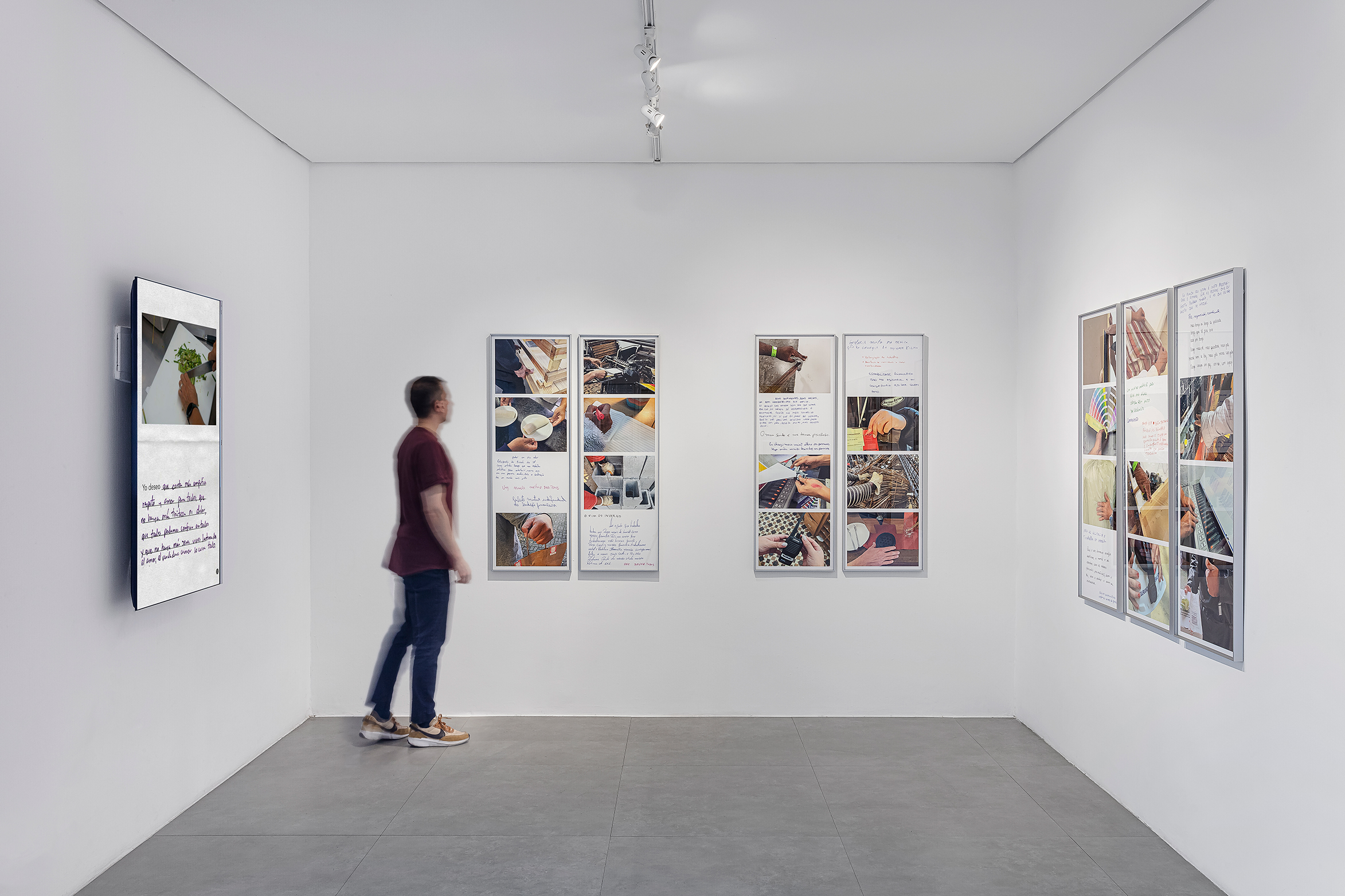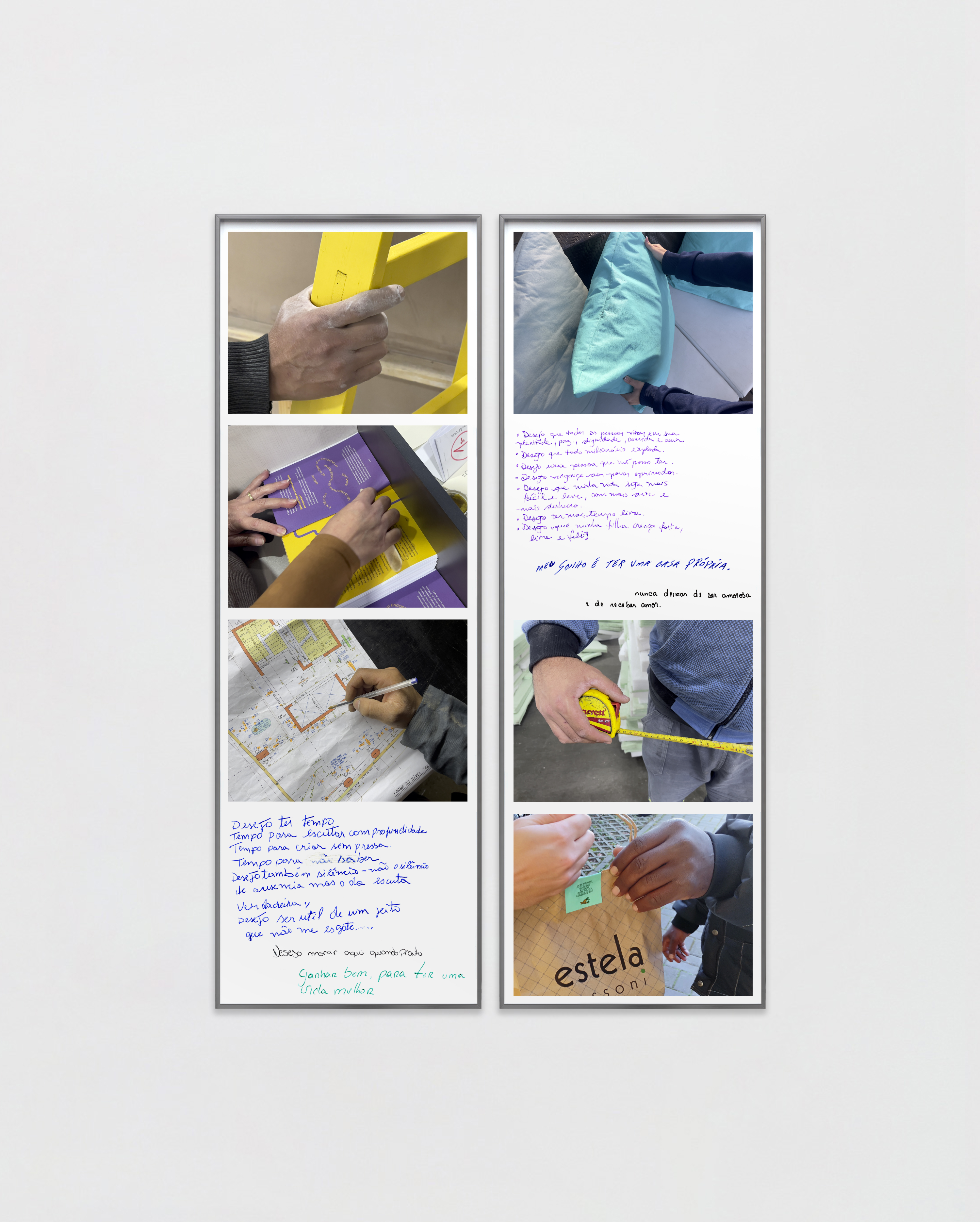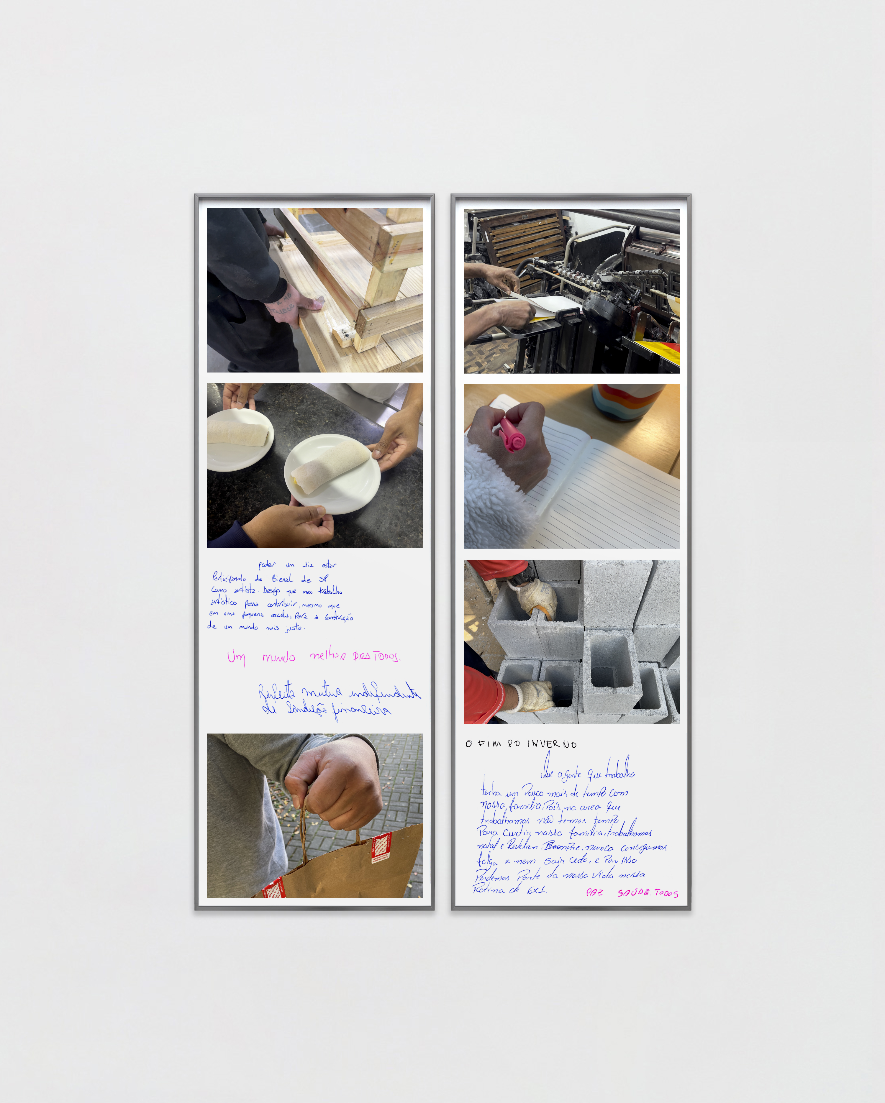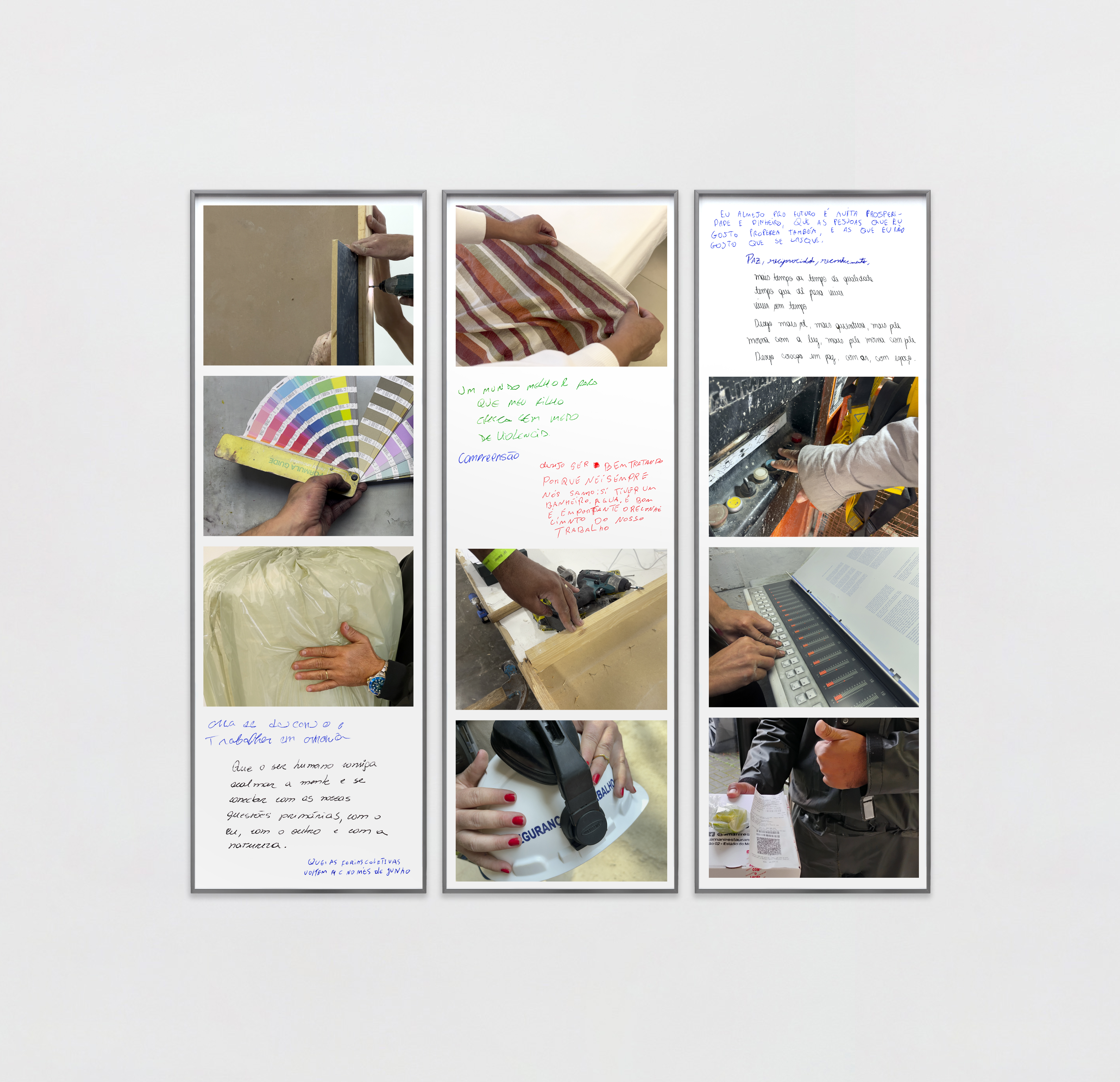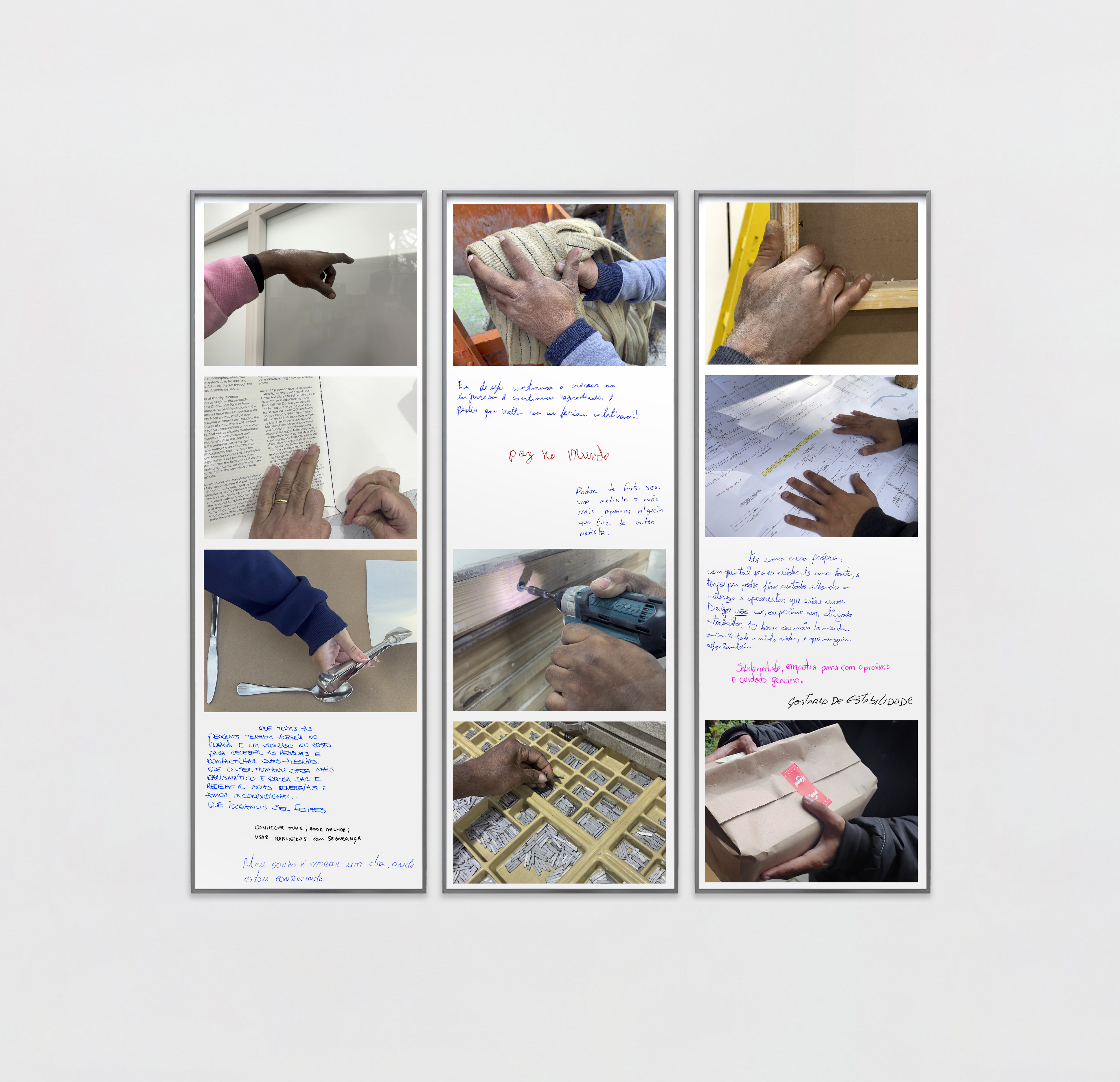 The artist photographs the hands of workers performing their tasks. They are employees of a printing company,hotel staff, delivery workers, construction workers, and workers at the São Paulo Biennial. She asks them to answer what they want, assuring the anonymity. The exhibition displays seven polyptychs with photographs and the answers in their original handwriting.