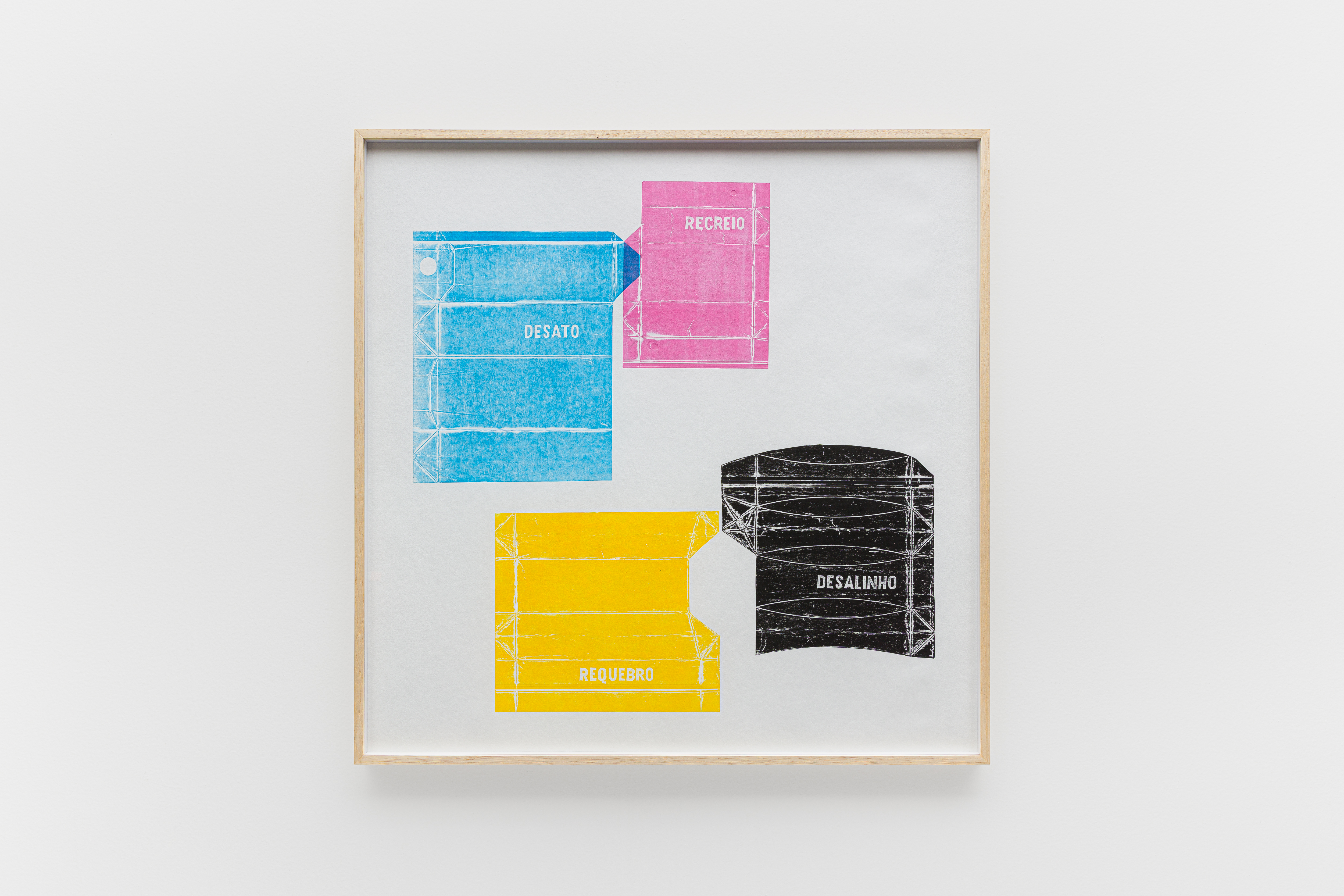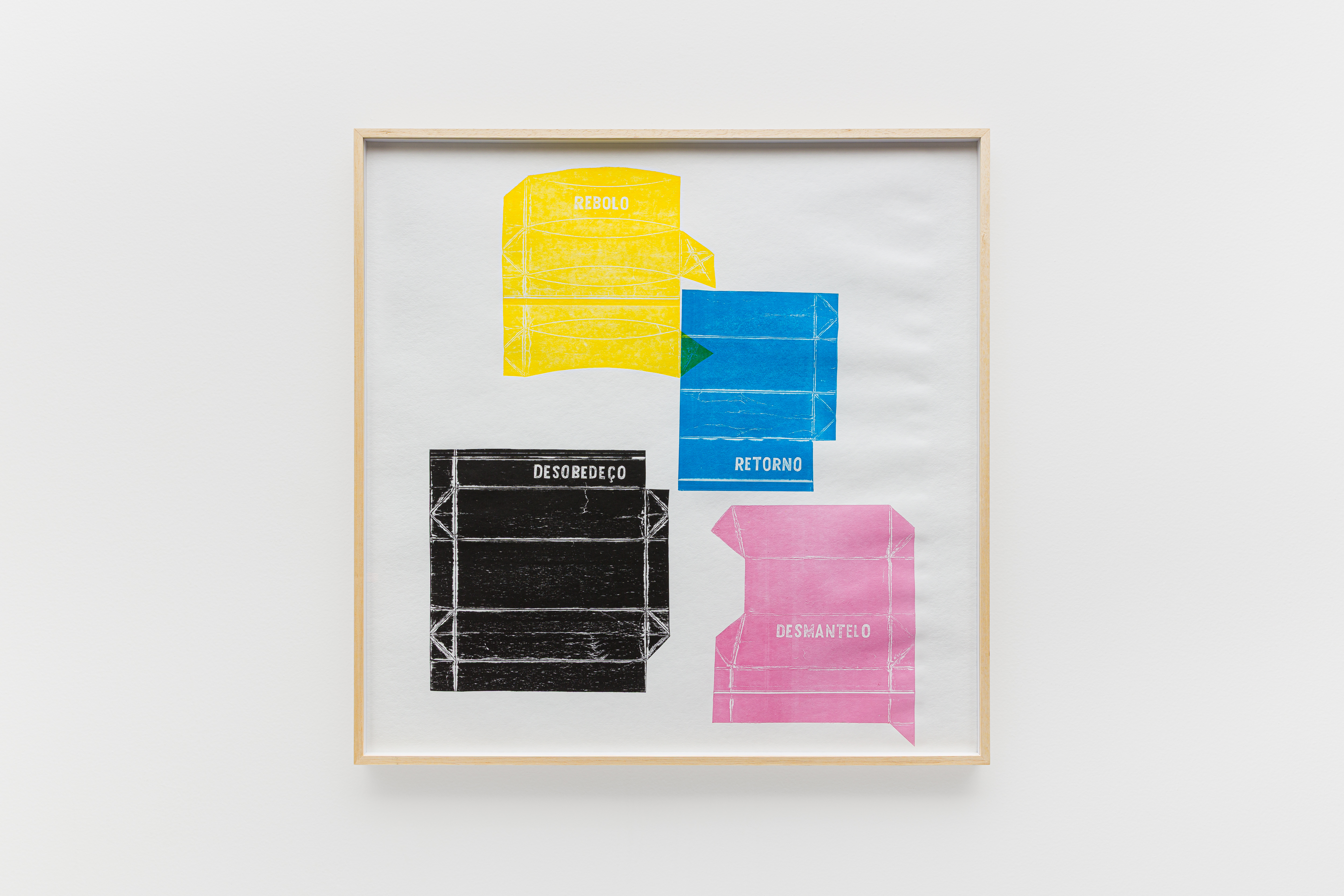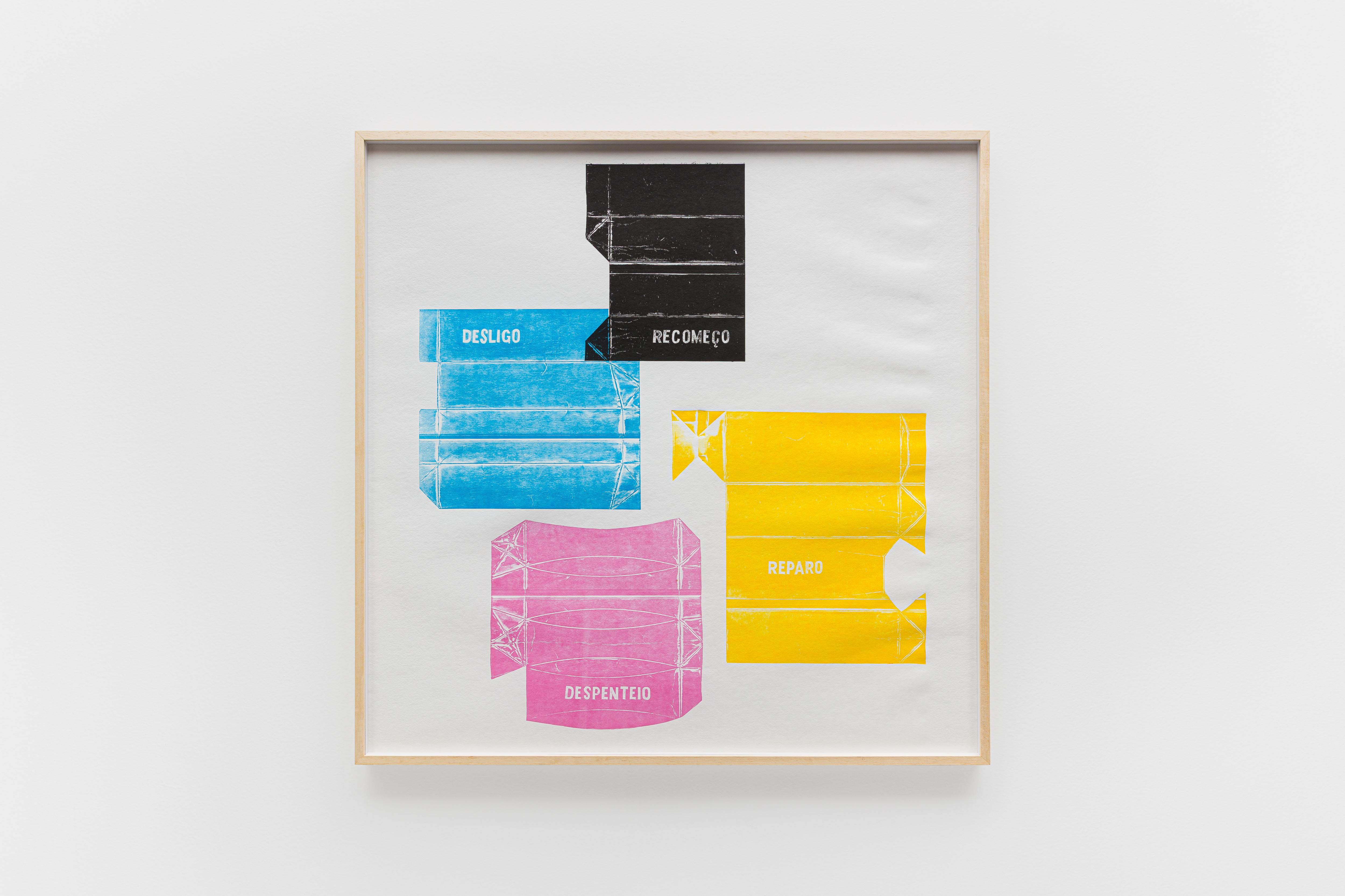 In the installation Modelo para armar (A Model Kit) that occupies the gallery's main room, nouns cut from magazines published in Brazil since 1973 (the artist's birth year) are glued onto fragments of cardboard boxes, which can no longer be reassemble as boxes. The concepts of historical, political, affective, relational narratives and language itself detour into crisis and are there like a puzzle, to be reassembled, rearranged, resignified.