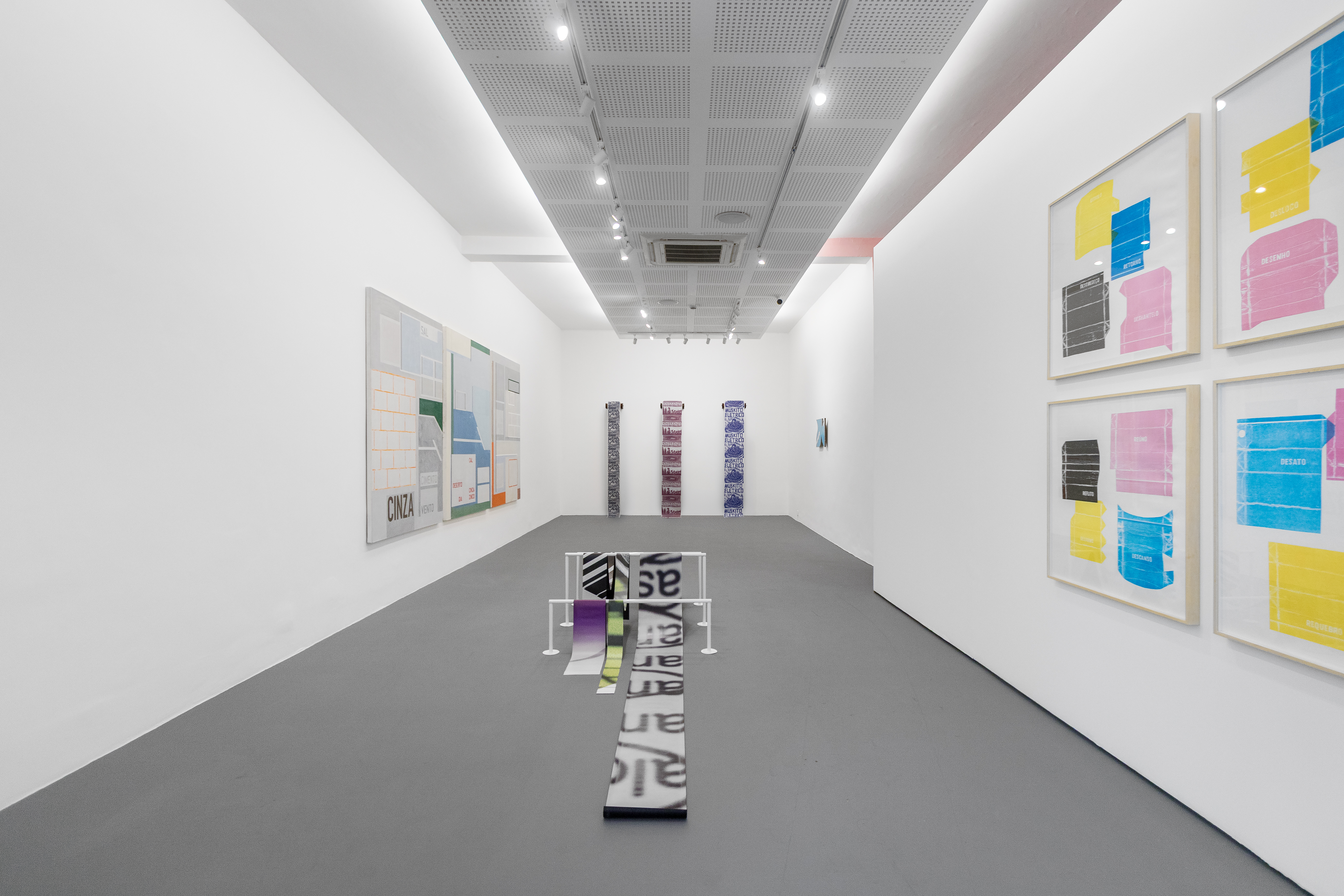 “Domine seu idioma (Master your language), a saying the artist found in a dictionary, takes on fresh meaning. Once again, the exploration of letters in their graphical, imagistic aspect opens doors to a dimension of language that will not allow itself to be fixated by any deciphering. A set of piled-up dictionaries with intense chromatic power, representing a paradigm whereby words perpetuate power and privilege, gets reclaimed in an unpredictable future. Words, in turn, will not allow themselves to be easily taken as pieces of a discourse. They glide, creating an ethics that points to the reverse of an imperative order.”